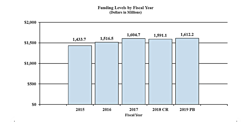 Budget Policy: The FY 2019 President’s Budget estimate is $1,612.192 million, an increase of $21.140 million or 1.33 percent compared to the FY 2018 Annualized CR level.