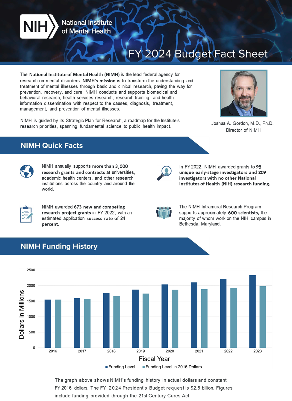 Major changes by budget mechanism and/or budget activity detail are briefly described below. Note that there may be overlap between budget mechanism and activity details and these highlights will not sum to the total change for the FY 2024 President’s Budget request for NIMH. The FY 2024 President’s Budget request is $2,541.7 million, an increase of $200.0 million compared to the FY 2023 Enacted level. The request includes $86.0 million provided through the 21st Century Cures Act.