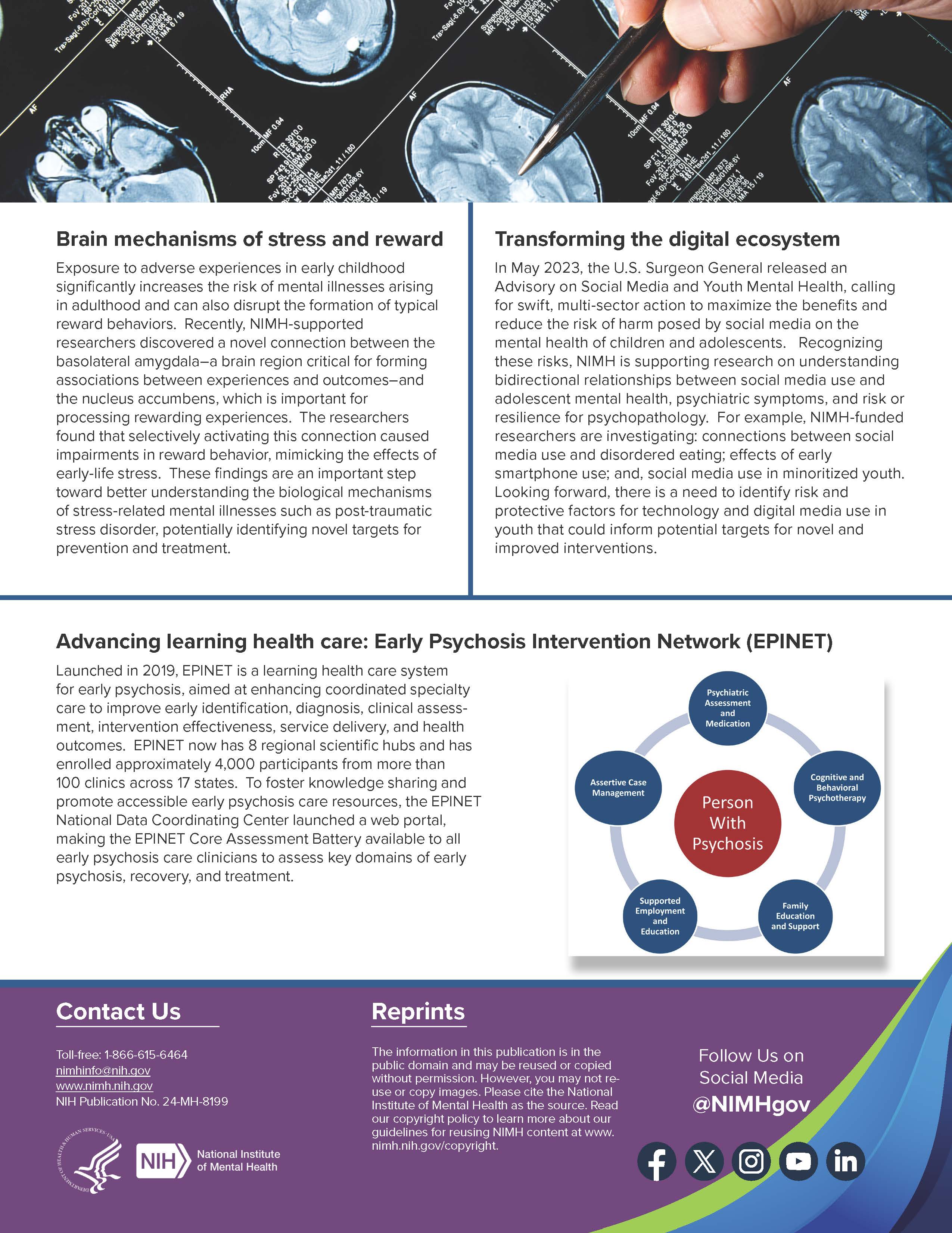 NIMH is pursuing an ambitious and collaborative research agenda spanning basic, translational, and clinical research with the potential to improve clinical care over the short, medium, and long term. In May 2023, NIMH published an update to its Strategic Plan for Research.7 Most notably, the updated Plan emphasizes the institute’s commitment to funding research focused on reducing mental health disparities and promoting health equity. NIMH also published a new edition of the Strategic Plan Progress Report,8 which highlights significant accomplishments made during FY 2022 toward achieving the goals described in the Strategic Plan. These accomplishments reflect the institute’s sustained commitment to ensuring the relevance, timeliness, and real-world impact of the research that NIMH supports.