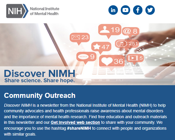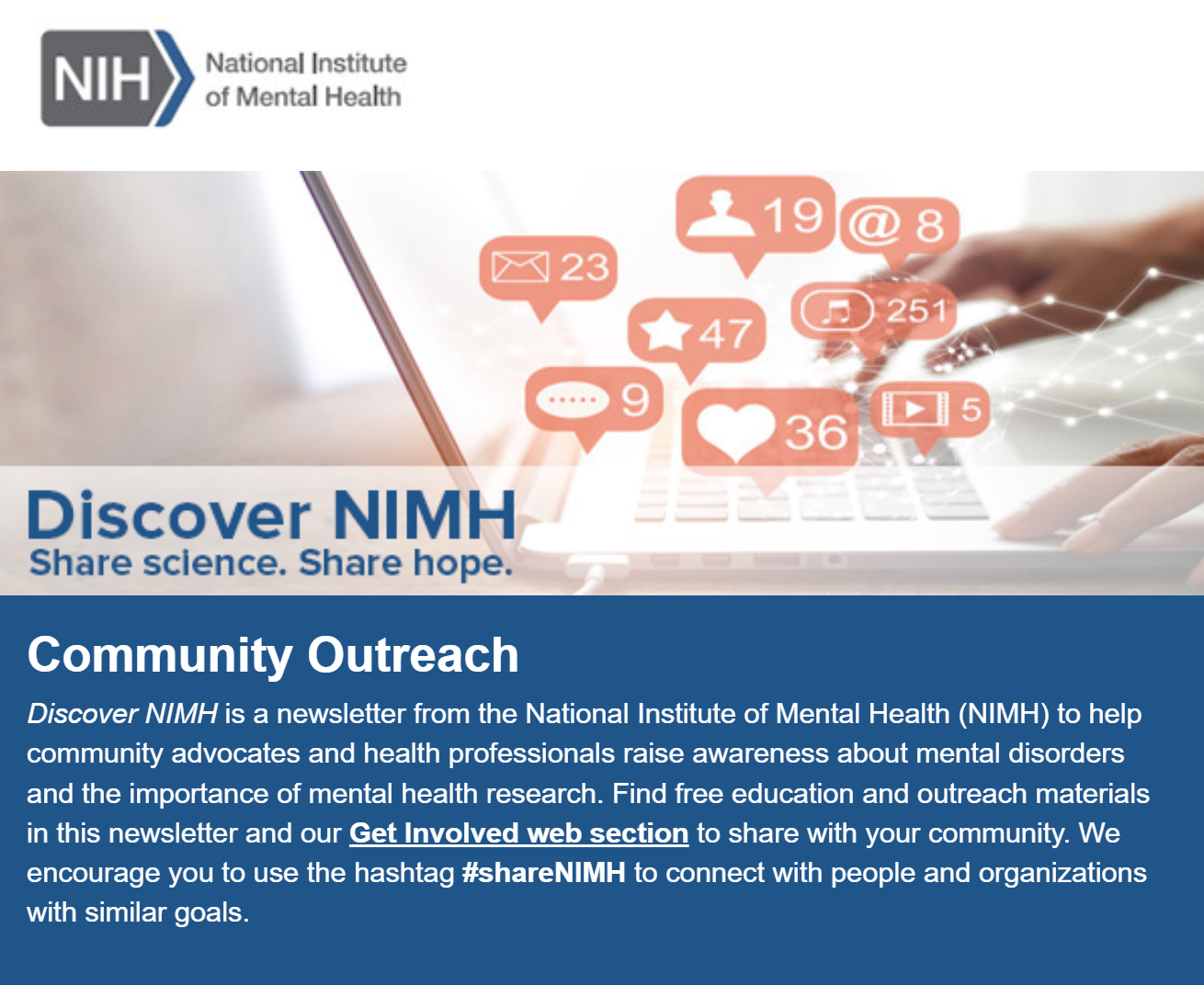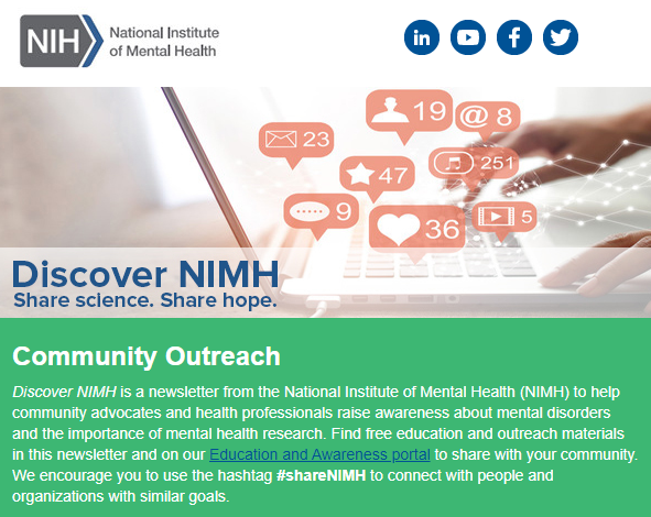 Help NIMH raise awareness about mental health and the importance of mental health research by sharing free education and outreach materials with your community. Sign up to receive the Discover NIMH newsletter to learn about new materials! https://go.nih.gov/u56EpCw #shareNIMH