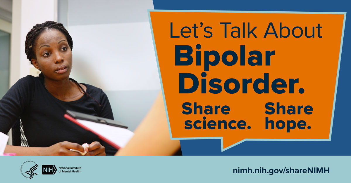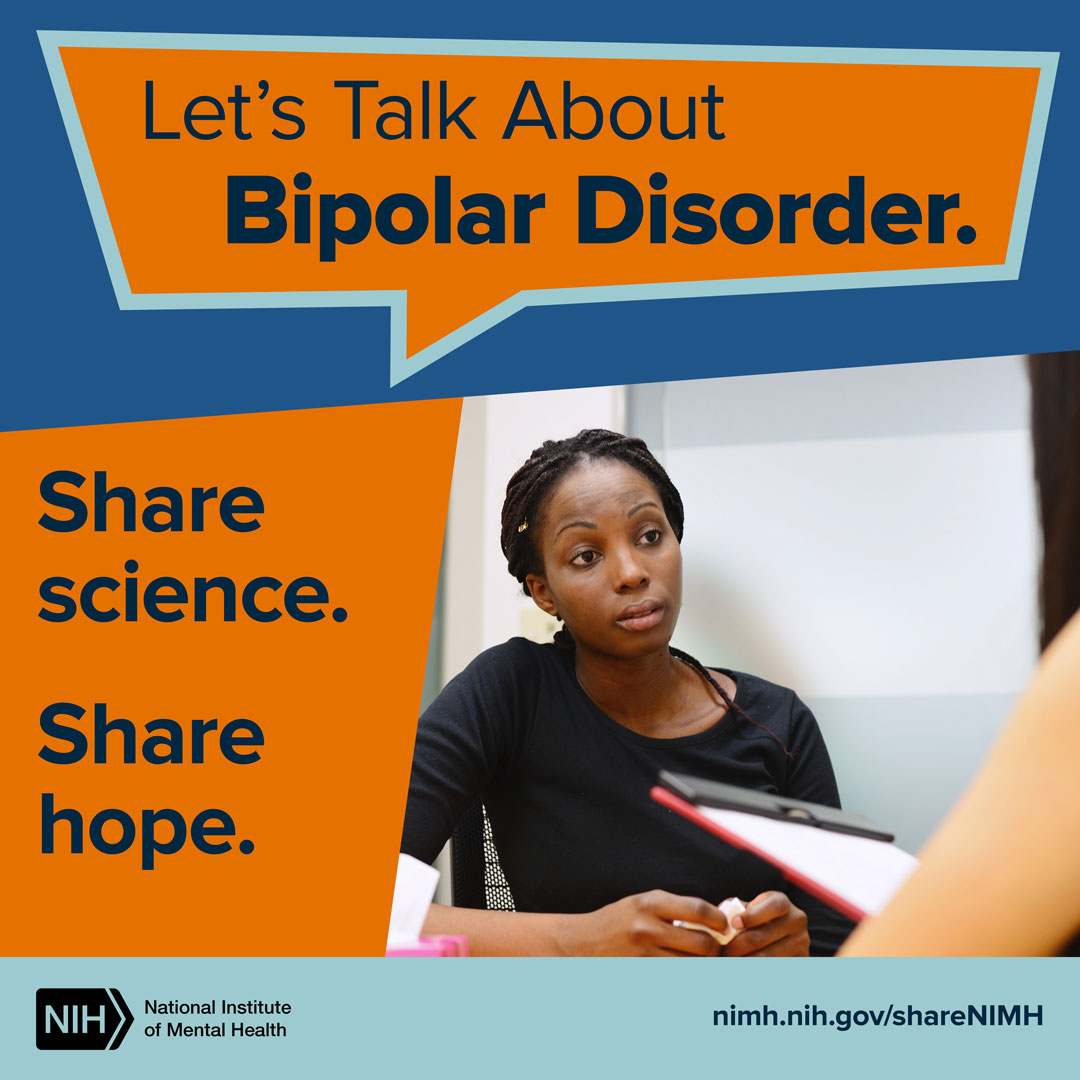 Alt text: Let’s Talk About Bipolar Disorder. Share science. Share hope. nimh.nih.gov/shareNIMH. HHS NIH logos. National Institute of Mental Health.