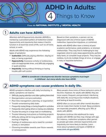 It is never too late to seek a diagnosis and treatment for ADHD and any other mental health condition that may occur with it. Effective treatment can make day-to-day life easier for many adults and their families. Find tips for talking with a health care provider.