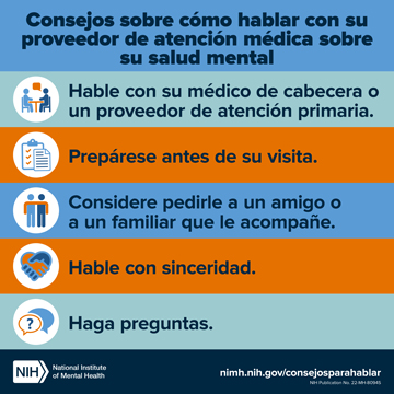 Si va a consultar con su proveedor de atención primaria por otros problemas de salud, recuerde mencionar sus problemas de salud mental. La salud mental forma parte integral de la salud. A menudo, las personas con trastornos mentales pueden estar en riesgo de presentar otros problemas médicos, como enfermedades del corazón o diabetes. En muchos entornos actuales de atención primaria es posible que le pregunten si siente ansiedad o depresión, o si ha tenido pensamientos suicidas. Aproveche esta oportunidad para hablar con su proveedor de atención primaria, quien puede referirlo a un especialista en salud mental. También puede visitar nuestra página de ayuda para las enfermedades mentales (en inglés) para obtener información sobre cómo encontrar un proveedor de atención médica o tratamientos.