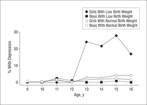 Among the 5.7 percent of girls in the study with low birth weight, more than 38 percent developed at least one episode of depression as teens, compared to only 8.4 percent with normal birth weight.