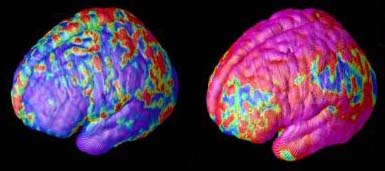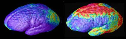 Composite MRI scan data showing areas of gray matter loss over 5 years, comparing 12 normal teens (left) and 12 teens with childhood onset schizophrenia. Red and yellow denotes areas of greater loss. Front of brain is at left.