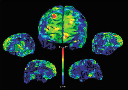 Patients with schizophrenia who had a history of childhood bedwetting showed reduced gray matter (the working tissue of the brain) in the front of the brain, particularly an area near the top on the right side (large red area). The frontal areas are known to be involved in bladder control and have also been implicated in schizophrenia, hinting that the childhood problem and attendant structural anomalies may represent a vestige of an early insult to the developing frontal cortex. Structural and functional MRI image data.