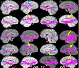Diffusion tensor imaging scans show differences in brain wiring between Williams Syndrome patients (WS) and paired normal controls (NC). Four patients showed aberrant long-distance connections, or fiber tracts, coursing from the back of the brain to an area in the top front of the brain, particularly in the right hemisphere (yellow arrows). One patient had an aberrant tract projecting to a somewhat lower area in the mid front of the brain (blue arrow). Each row shows left and right views of long-distance fiber tracts in a patient and matched control set, as revealed by diffusion tensor MRI.