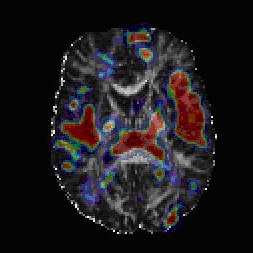 Composite diffusion tensor imaging scan image shows areas (red and to a lesser extent blue) where white matter fiber tracts and surrounding tissue differed between schizophrenia patients and controls.