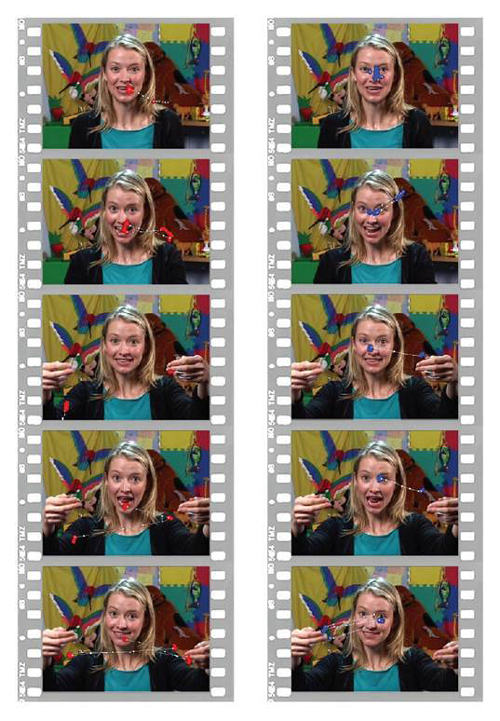 Decline in eye fixation reveals signs of autism present already within the first 6 months of life. Data from a 6-month-old infant later diagnosed with autism are plotted in red. Data from a typically developing 6-month-old are plotted in blue. The data show where the infants were looking while watching a video of a caregiver.