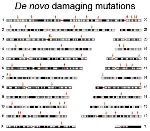 Seemingly disparate and scattered throughout the genome, spontaneous, or de novo, damaging mutations found in people with schizophrenia (red) clustered within genes forming a suspected disrupted network in the prefrontal cortex, thought to impair formation of new neurons during prenatal development.