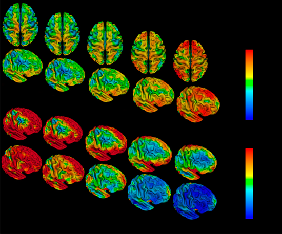“The heritability of cortex thickness increases gradually throughout late childhood and adolescence, with three more uniquely human areas, including circuitry supporting language and thinking, emerging as the most genetically influenced,” explained Jay Giedd, M.D., of the National Institute of Mental Health. “These same increasingly heritable brain areas are also most implicated in mental illnesses, which typically emerge in late adolescence. So the findings may provide insights into the workings of gene-by-environment-by age interactions that underlie the perplexing delayed onset of these disorders.”