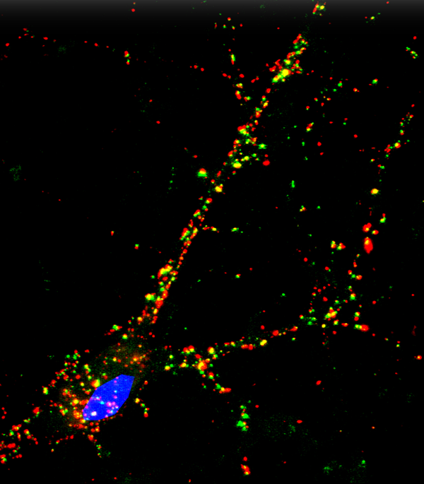 Synapses – sites of intercellular communications –are revealed in a mature iPSC cortex neuron derived from a participant in the study. Immune-based staining shows synapse markers (red, green) and the cell’s nucleus (blue).