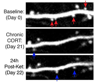 Twenty-four hours after receiving a single dose of ketamine, mice exposed to stress showed a reversal of behaviors related to depression and an increase in dendritic spine formation when compared to stressed mice that had not received ketamine. These new dendritic spines were functional, creating working connections with other neurons.