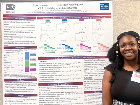 At the 24th Annual NIMH IRP Fellows Scientific Training Day, held September 29, 2022, Olufunmilayo (Ayo) Telli, BS (shown with her poster), an Intramural Research Training Award (IRTA) fellow and Undergraduate Scholarship Program (UGSP) scholar in Dr. Melissa Brotman's Neuroscience and Novel Therapeutics Unit, was awarded First Place in the 2022 NIMH IRP Outstanding Poster Award Competition for her poster on "Associations between Inconsistent Parenting and Child Irritability in a Clinical Sample." After her NIMH fellowship, Ayo plans to obtain MD and PhD degrees to become a physician scientist.