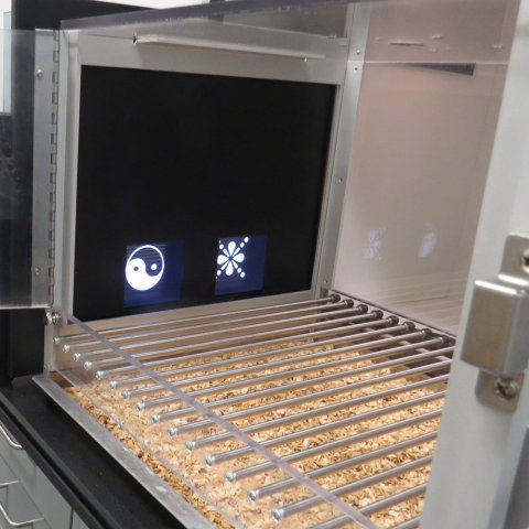 A close-up photo of a single touchscreen operant chamber showing example of visual stimuli presented on the monitor. Rats make responses by touching the correct stimulus with their nose
